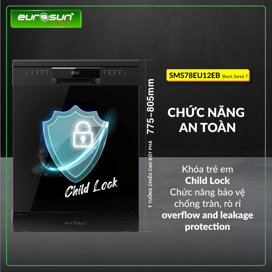 Eurosun luôn chú trọng thiết kế tỉ mỉ từng chi tiết trong sản phẩm. Máy rửa bát SMS78EU12EB được thiết kế hiện đại với chiều cao lý tưởng 775mm, đáp ứng phù hợp với tiêu chuẩn lắp đặt tủ bếp của người Châu Á nói chung và các gia đình Việt Nam nói riêng. Với gam màu bạc sang trọng, nhã nhặn sản phẩm gây ấn tượng với khách hàng ngay từ cái nhìn đầu tiên.