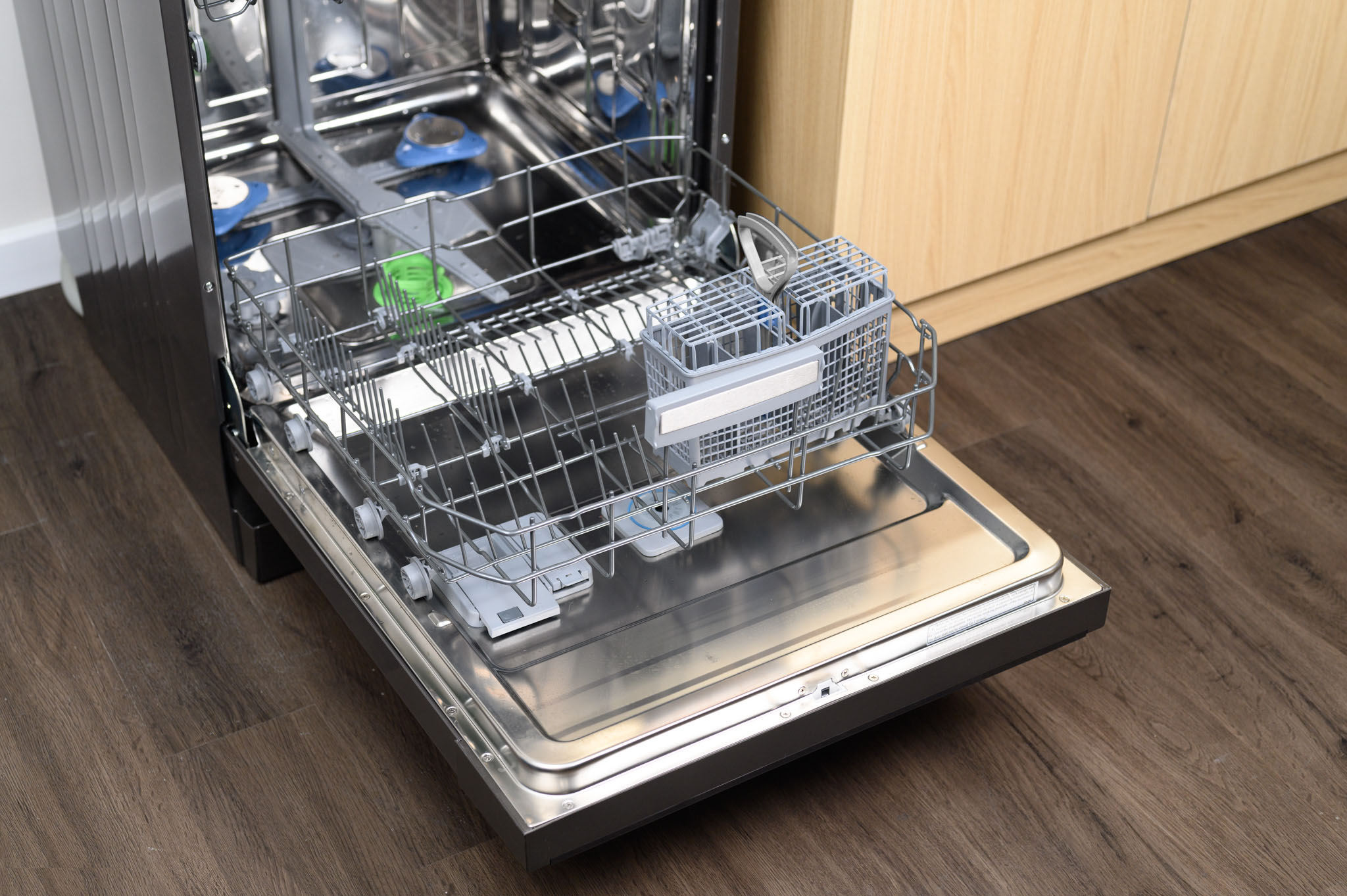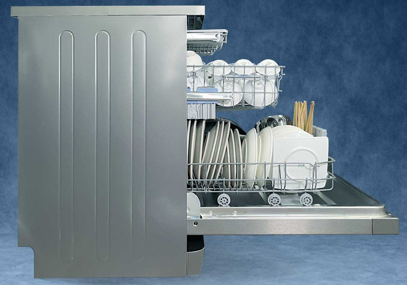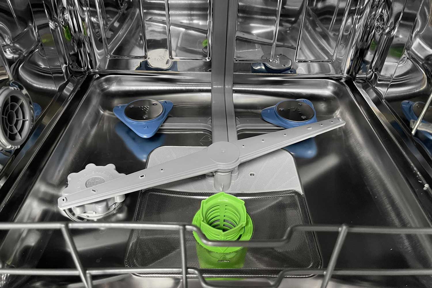Giàn rửa dưới cùng của máy có khoang chứa rộng hơn, cho phép rửa các loại nồi nấu, chảo, bát đĩa to….Các loại đĩa thìa, người dùng có thể cho vào vào giỏ màu xám ở trong khay rửa dưới cùng hoặc xếp làm ngang, sao cho các không có bất cứ vật dụng nào cản trở vào tay quay gạt nước của máy.