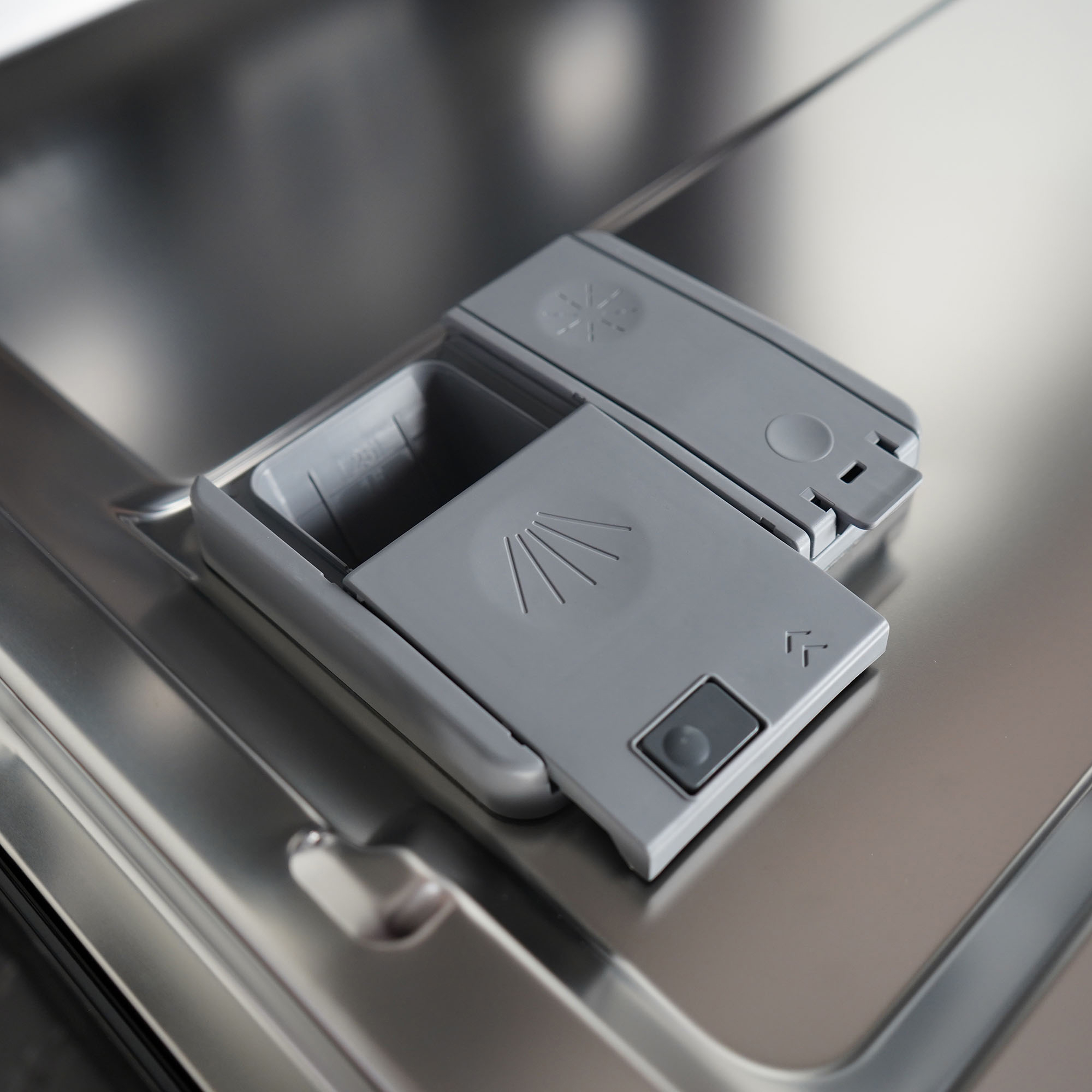 Bên cạnh đó, phần cánh cửa đóng mở có ngăn đựng chất làm bóng và ngăn đựng viên tẩy rửa. Chất làm bóng giúp cho bát đĩa được sáng và bóng hơn, trong khi đó viên tẩy rửa là chất liệu quan trọng để đánh sạch mọi vết bẩn.