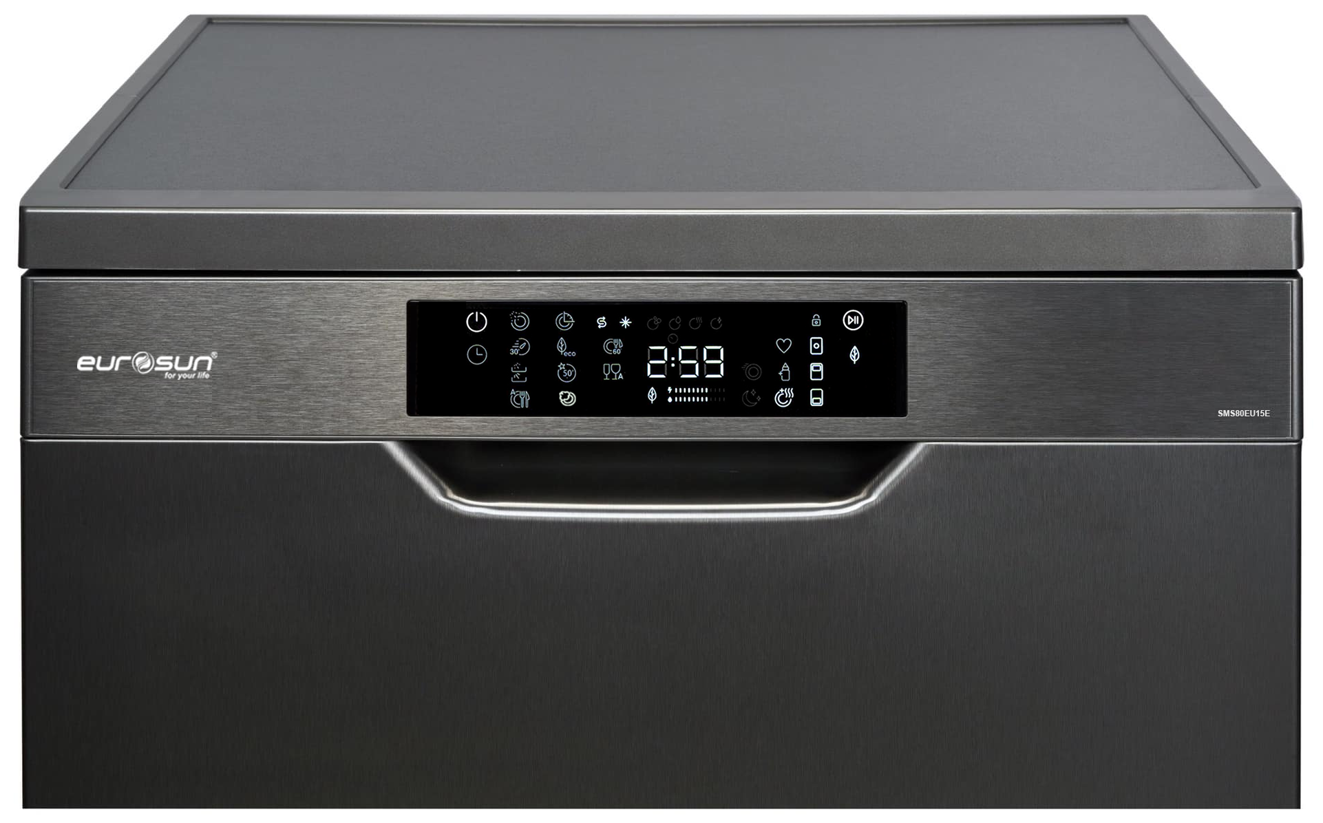 Máy rửa bát Eurosun SMS80EU15E có công suất tiêu thụ là 1900W, lượng nước tiêu thụ là 5.4-9 lít/1 lần rửa, cho phép rửa 14 bộ bát đĩa Châu Âu tương đương với 1,5-2 bữa ăn Việt (gia đình 4-6 thành viên). Máy trang bị 10 chương trình rửa được tùy chỉnh dễ dàng trên bảng điều khiển điện tử kết hợp màn hình LED.