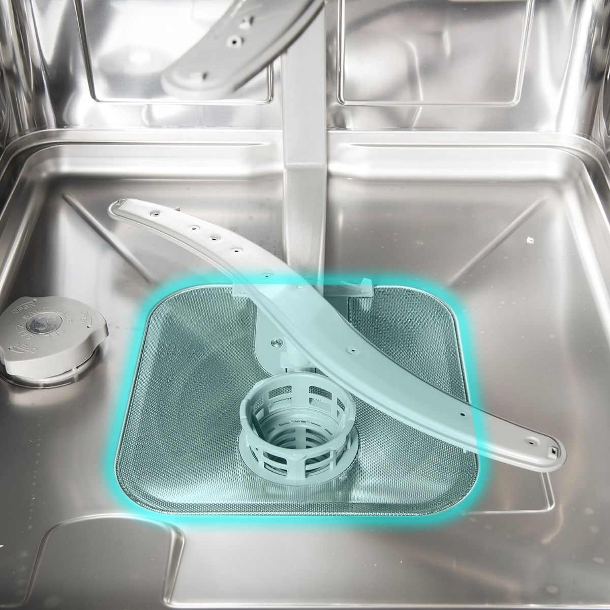 Ở phía trong bên của máy rửa bát Latino LT WD1304 có chứa ngăn chứa muối và ngăn chứa các chất rác trong quá trình rửa. Người dùng cần dùng loại muối chuyên dụng cho máy rửa bát. Mỗi lần đổ muối sẽ dùng được khoảng 1,5 tháng đến 2 tháng. Khi hết lượng muối cần thiết, máy sẽ báo hiệu ở trên bảng điều khiển.