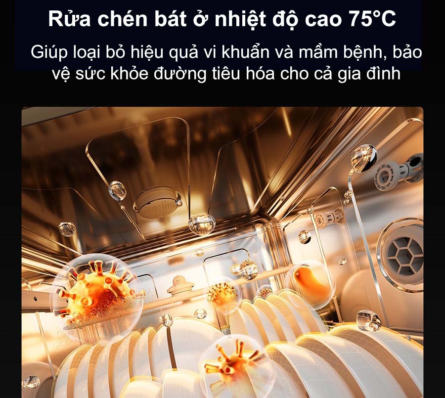 Máy rửa bát Xiaomi 13 bộ Mijia S2 áp dụng công nghệ rửa ở nhiệt độ cao lên đến 75°C, loại bỏ vi khuẩn và bảo vệ sức khỏe cho các thành viên trong gia đình. Đây là giải pháp lý tưởng giúp loại bỏ các loại vi khuẩn nguy hiểm, đảm bảo vệ sinh tuyệt đối cho bữa ăn hàng ngày. Bên cạnh đó, tính năng lưu trữ kháng khuẩn 7 ngày đảm bảo bát đĩa luôn khô ráo và sạch sẽ, hạn chế tối đa nguy cơ vi khuẩn phát triển, giúp bạn yên tâm khi sử dụng.