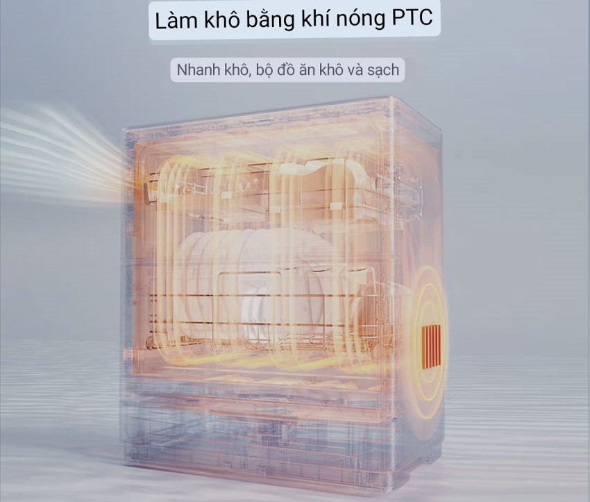 Công nghệ sấy khô bằng khí nóng PTC giúp bát đĩa sau khi rửa luôn khô ráo và sạch sẽ. Quá trình sấy diễn ra nhanh chóng, giúp bạn tiết kiệm thời gian mà vẫn đảm bảo an toàn vệ sinh thực phẩm, mang lại sự tiện lợi tối đa cho người dùng.