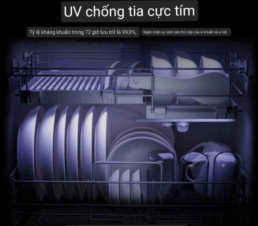 Sản phẩm được trang bị công nghệ tia UV khử trùng hiệu quả lên đến 99,99% trong 72 giờ, giúp loại bỏ vi khuẩn và virus gây hại như E. coli, Staphylococcus aureus,… Điều này đảm bảo bát đũa luôn sạch sẽ và an toàn cho sức khỏe gia đình, mang đến sự yên tâm tuyệt đối trong quá trình sử dụng.