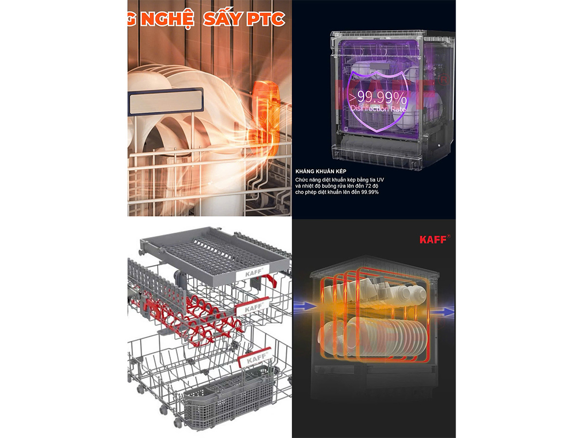 Máy rửa chén bát Kaff tích hợp hệ thống PTC sấy khô khí nóng an toàn, hiệu quả vượt trội. Sau khi quá trình rửa chén bát hoàn tất, máy sẽ dẫn không khí tự nhiên bên ngoài thông qua bộ gia nhiệt PTC để tạo thành luồng khí nóng thổi vào khoang máy và nhanh chóng lấy đi hơi ẩm còn tồn lại, giúp cho các bộ đồ ăn được sấy khô hoàn toàn