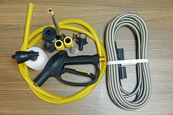 Ống hút nước vào 2m kèm bộ kit kết nối vòi nước và bộ lọc nước đầu vào tiện lợi, vòi nước áp lực đầu ra 20m kèm súng phun đa năng (tia + toả), giúp điều chỉnh tia nước từ tia sang toả, tự động từ nhẹ tới mạnh đánh tan mọi vết bẩn.