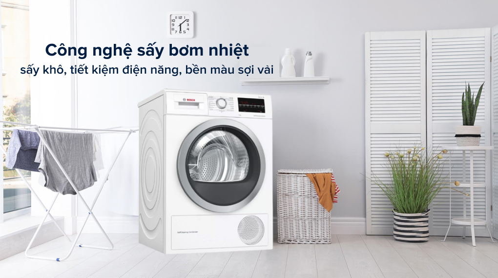 – Máy sấy quần áo Bosch sử dụng động cơ chổi than EcoSilence vận hành êm ái, hạn chế tiếng ồn, độ ồn chỉ khoảng 65 dB không gây khó chịu khi máy hoạt động, đồng thời tiết kiệm điện năng tiêu thụ.
