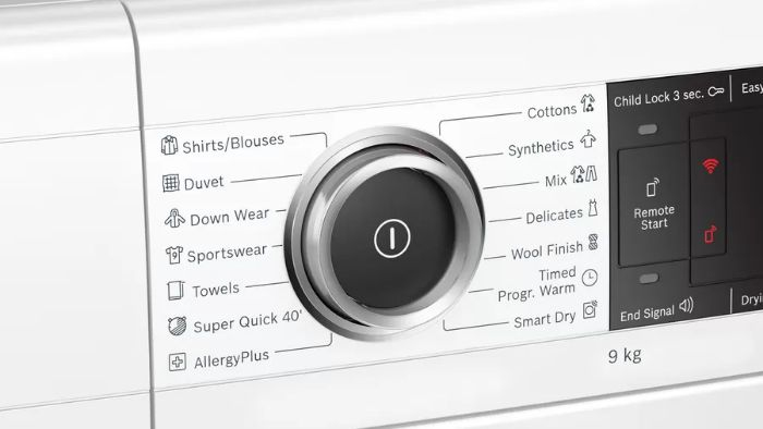 Máy sấy quần áo Bosch WTX87MH0SG trang bị núm xoay điều khiển và màn hình LED hiển thị giúp dễ dàng sử dụng trong quá trình sấy.