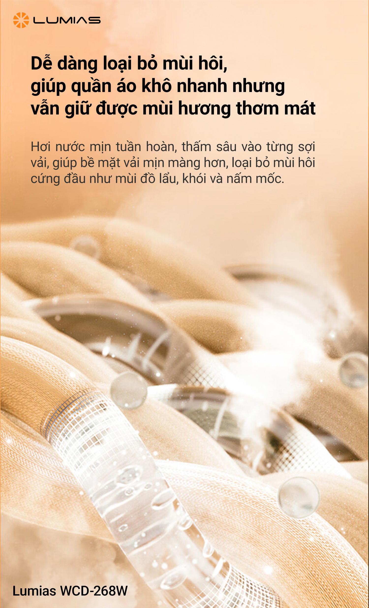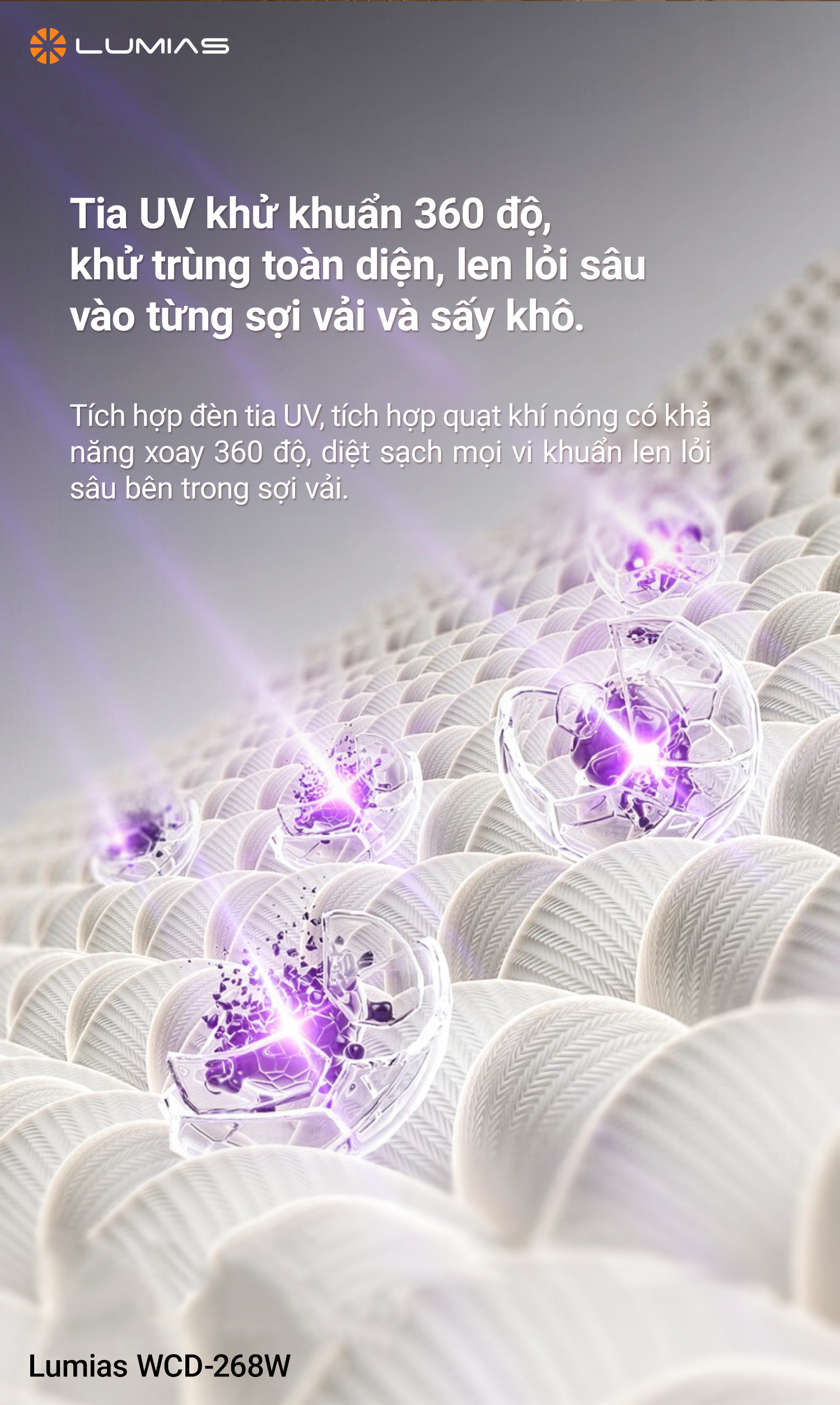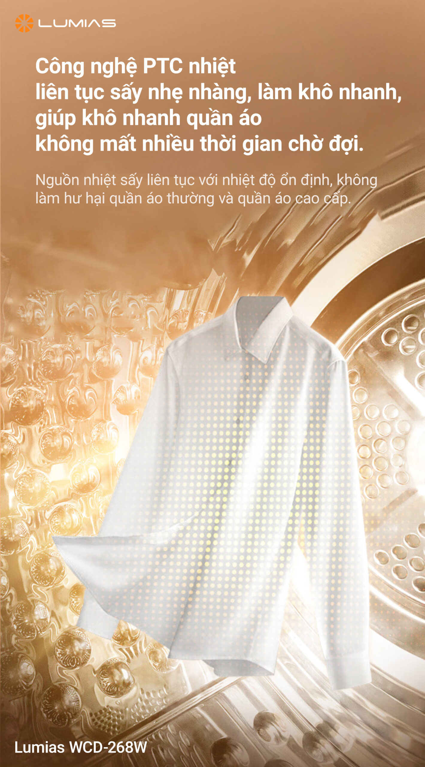 Công nghệ sấy PTC mang lại khả năng làm nóng nhanh chóng, ổn định. Tính năng khử trùng bằng tia UV giúp loại bỏ vi khuẩn, nấm mốc trên quần áo sau khi sấy, đảm bảo an toàn, đặc biệt là những gia đình có trẻ nhỏ hoặc người có làn da nhạy cảm. Dải nhiệt độ sấy từ 40-60ºC của máy sấy Lumias WCD-800W có thể dùng cho nhiều loại vải khác nhau, như quần áo hàng ngày đến các loại vải mỏng nhẹ. Đặc biệt, sản phẩm này giúp bảo vệ sợi vải khỏi bị hư tổn do nhiệt độ quá cao.