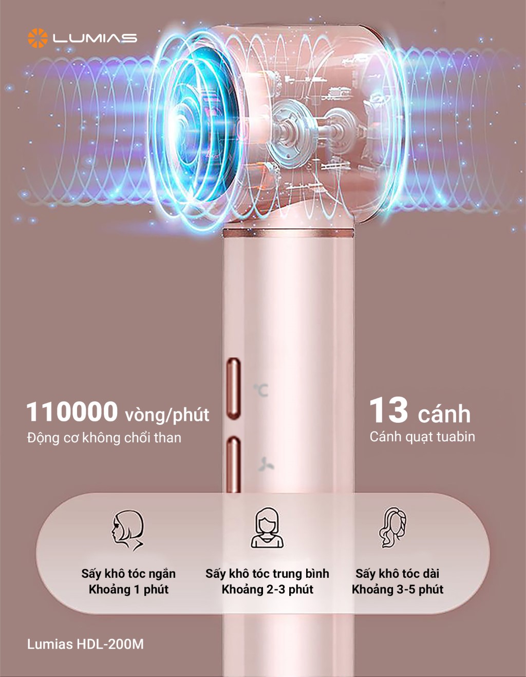 Máy sấy tóc đa năng Lumias HDL-200M công suất mạnh mẽ 1300W, động cơ không chổi than hoạt động 110.000 vòng/phút