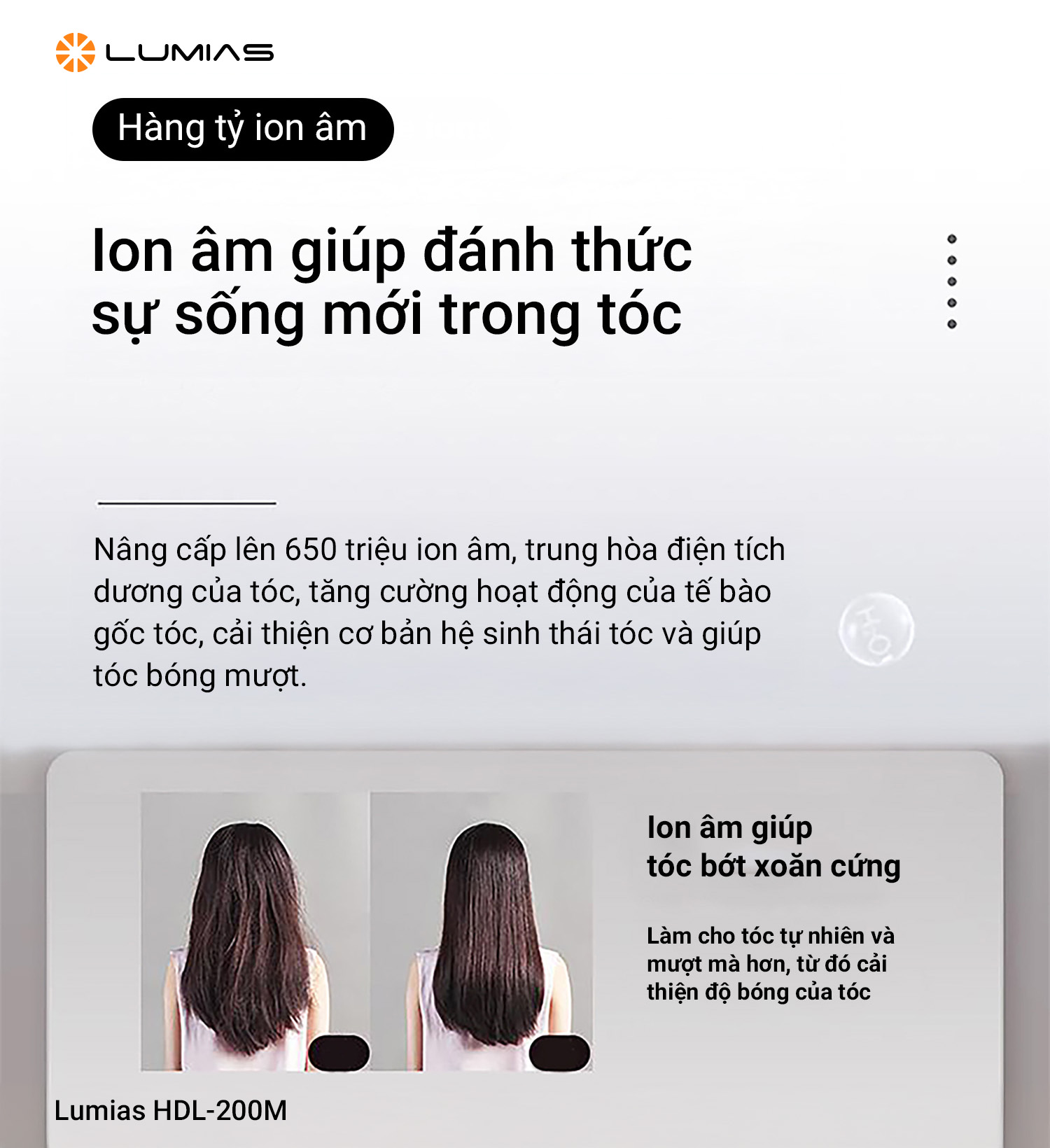 Công nghệ ion âm của máy sấy tóc tạo kiểu Lumias HDL-200M hoạt động bằng cách tạo ra 650 triệu ion âm, giúp trung hòa điện tích dương trên tóc, giữ ẩm cho tóc và ngăn ngừa tình trạng khô xơ, rối và chẻ ngọn do nhiệt độ cao. Hơn nữa, các ion âm tăng cường hoạt động của tế bào gốc tóc, cải thiện hệ sinh thái tóc, giúp tóc giảm xoăn cứng và trở nên tự nhiên, mượt mà hơn, nâng cao độ bóng của tóc.