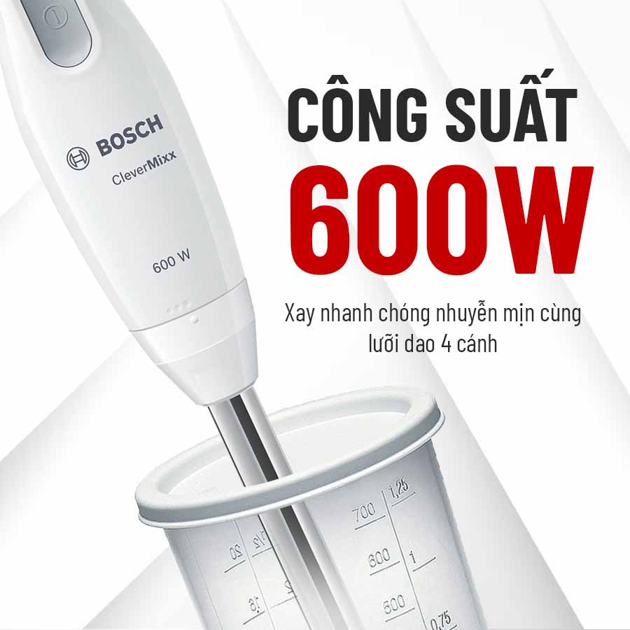 Mặc dù có thiết kế nhỏ gọn nhưng chiếc Máy xay cầm tay Bosch MSM26130 lại sở hữu công suất 600 W mạnh mẽ, hỗ trợ người dùng xay nhanh và nhuyễn mọi loại nguyên liệu.