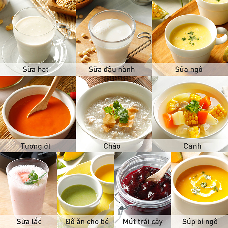Thưởng thức từ món nóng đến lạnh với 10 chương trình nấu được cài đặt sẵn bao gồm: Sữa đậu nành, Sữa ngô, Sữa hạt, Thức ăn dặm, Cháo, Súp, Canh, Sữa lắc, Mứt trái cây, Tương ớt, giúp tự động kiểm soát nhiệt, thời gian 1 cách chuẩn xác và an toàn hơn khi nấu ăn.