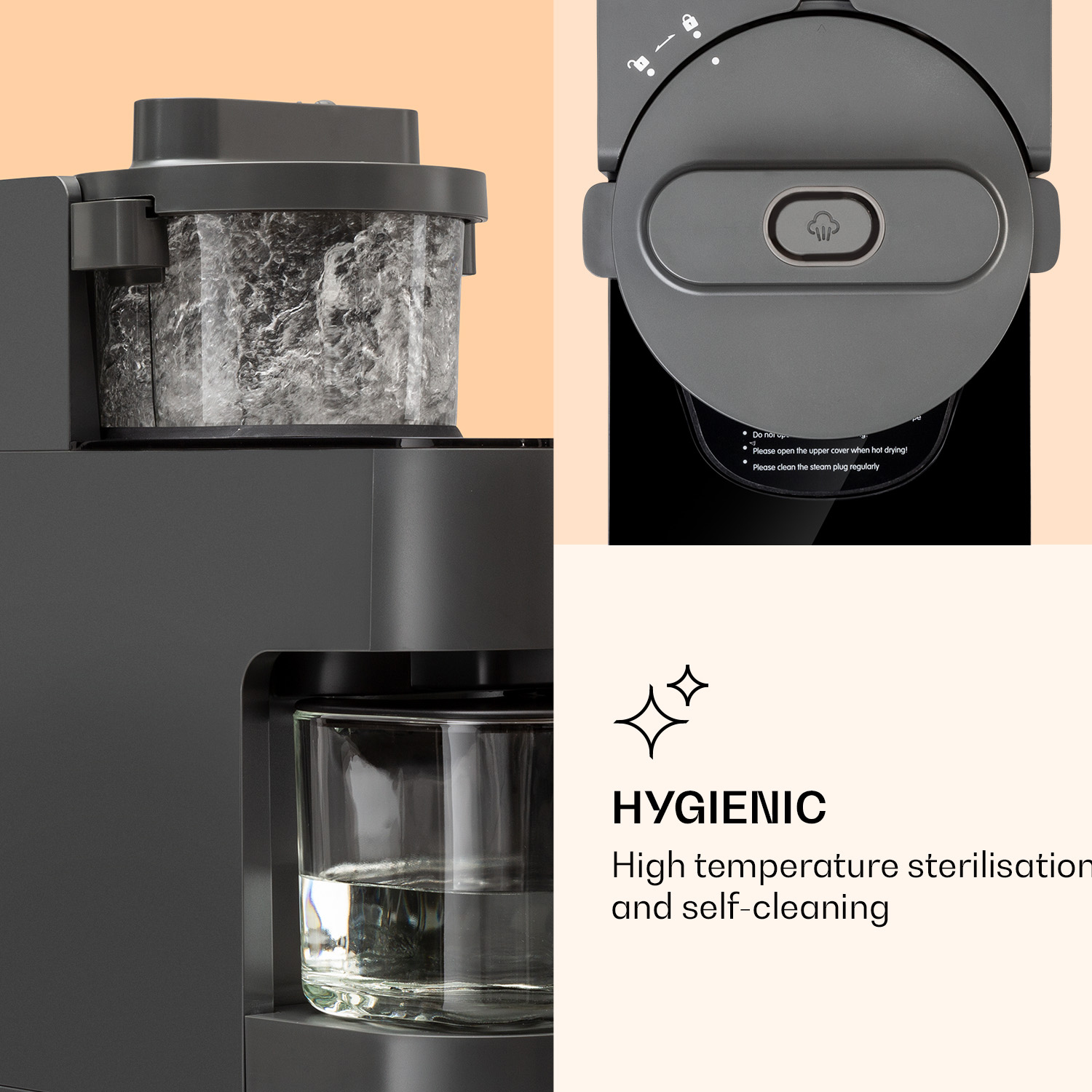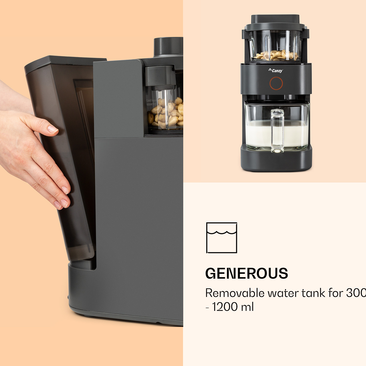 Nhìn tổng thể máy làm sữa hạt Canzy CZ-780K có thiết kế dạng phân tầng. Tầng trên cùng là khoang chứa nguyên liệu xay. Ở giữa nhô ra phía trước chính là bảng điều khiển. Tiếp là bảng điều khiển cảm ứng. Tầng dưới cùng chính là động cơ ở phía sau và phía trước là nơi lấy sữa thành phẩm và khoang chứa nước thải sau khi vệ sinh. Phía sau vẫn là bình đựng nước. Máy Canzy CZ-780K sẽ tự lấy nước để làm sữa hạt.