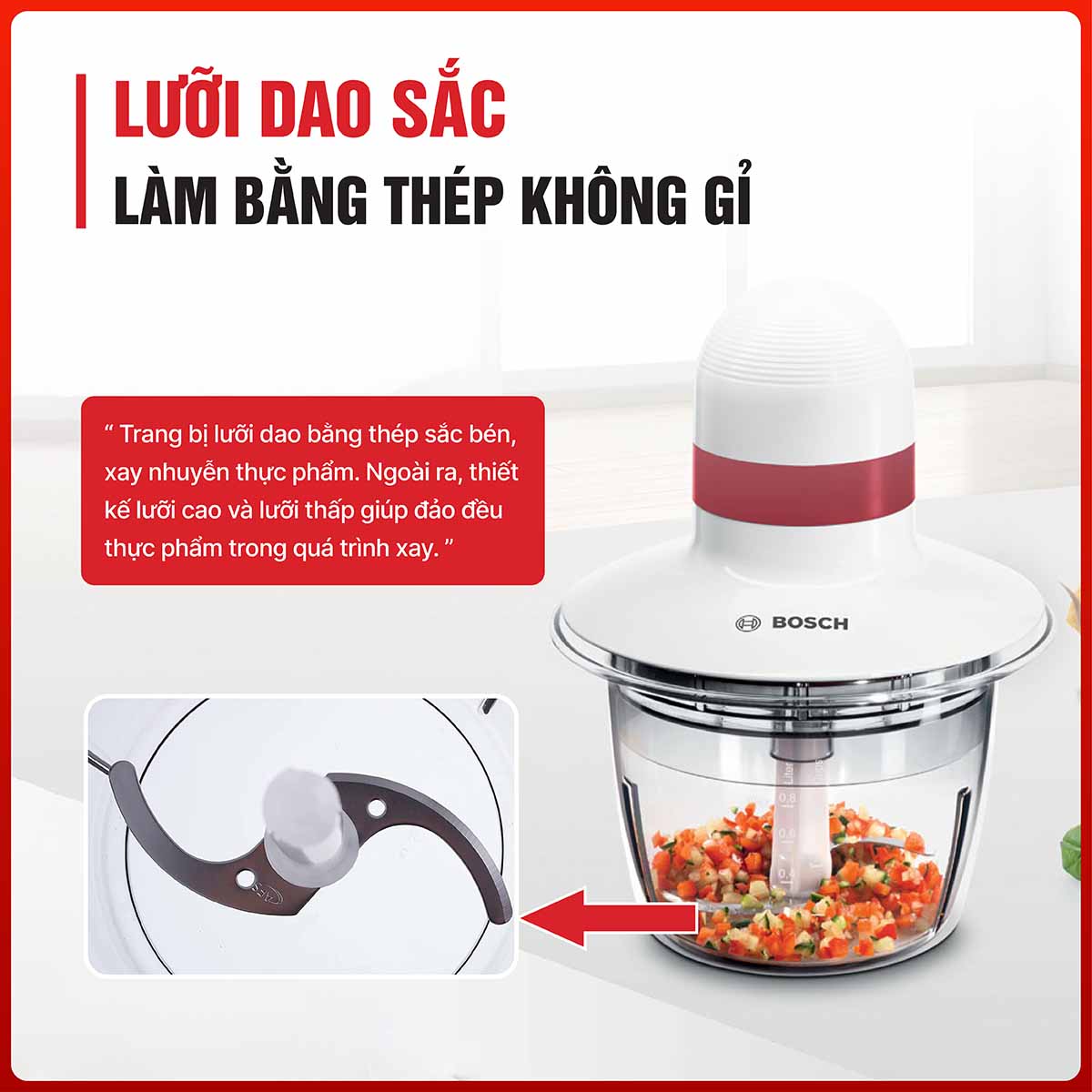 Máy xay Bosch MMRP1000 trang bị lưỡi dao bằng thép sắc bén, xay nhuyễn thực phẩm. Ngoài ra, thiết kế lưỡi cao và lưỡi thấp giúp đảo đều thực phẩm trong quá trình xay.