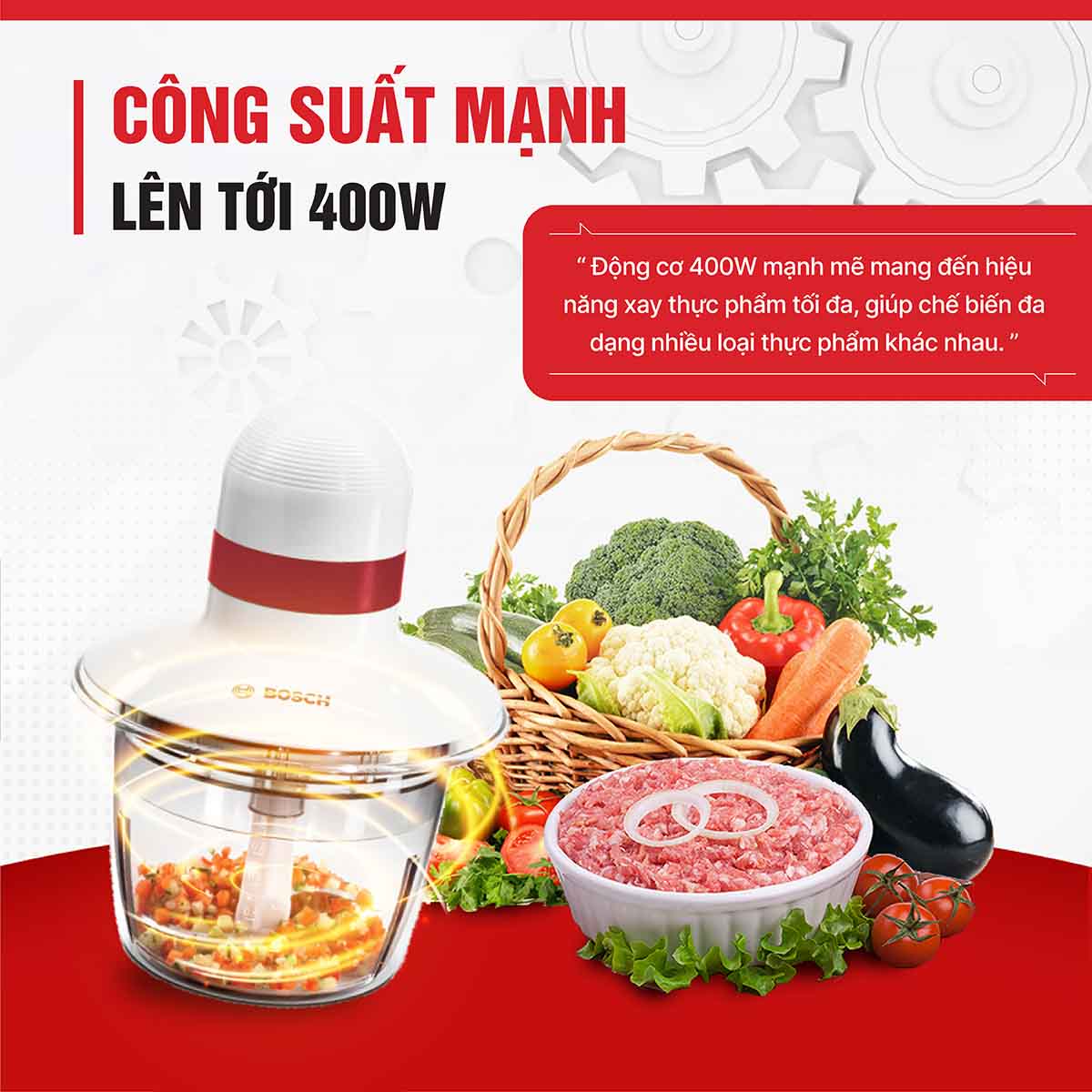Động cơ 400W mạnh mẽ mang đến hiệu năng xay thực phẩm tối đa. Với chiếc máy xay Bosch MMRP1000 trên tay, bạn dễ dàng xay nhuyễn nhiều loại thực phẩm khác nhau. Chẳng hạn như: