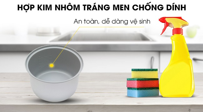 Một trong những ưu điểm nổi bật của nồi cơm điện Sharp KS-N182ETV-SW chính là lòng nồi được làm từ hợp kim nhôm phủ chống dính. Lớp chống dính này không chỉ giúp cơm không bị dính vào nồi, dễ dàng khi lấy ra mà còn giúp việc vệ sinh nồi sau khi sử dụng trở nên nhanh chóng hơn. Đồng thời, chất liệu này an toàn, không gây sản sinh các chất độc hại, bảo vệ sức khỏe cho cả gia đình.