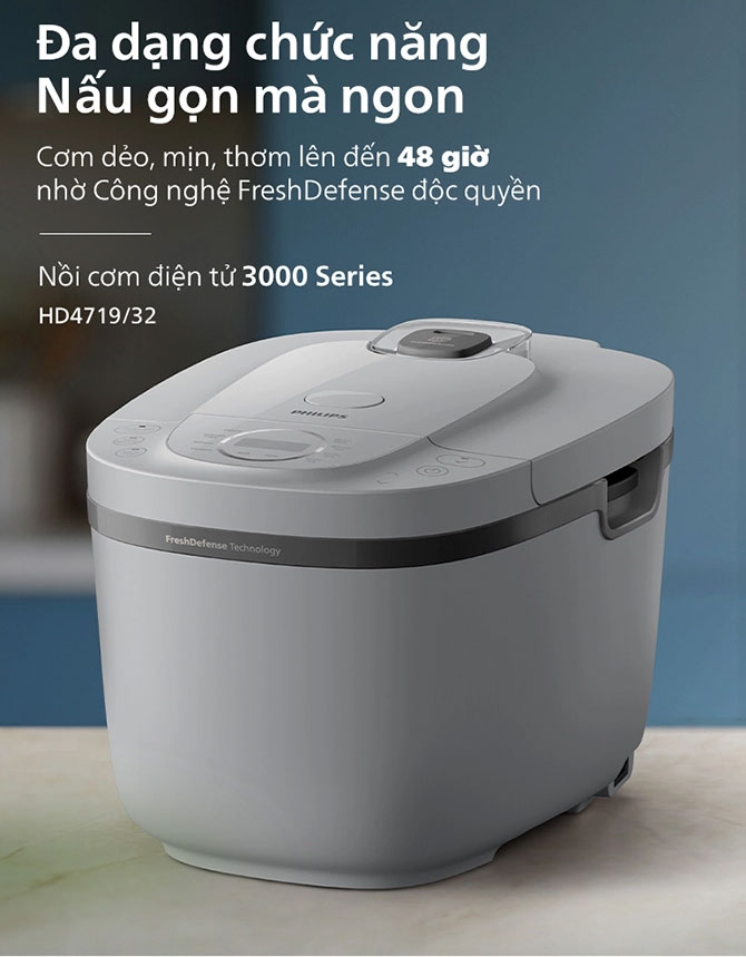 Với công suất 860W, nồi cơm điện Philips HD4719/32 giúp tiết kiệm thời gian nấu, không cần phải chờ đợi quá lâu để có một bữa cơm thơm ngon. Công nghệ FreshDefense giúp giữ cơm luôn ấm và thơm lâu trong 48 giờ mà không làm mất đi hương vị hay chất lượng.