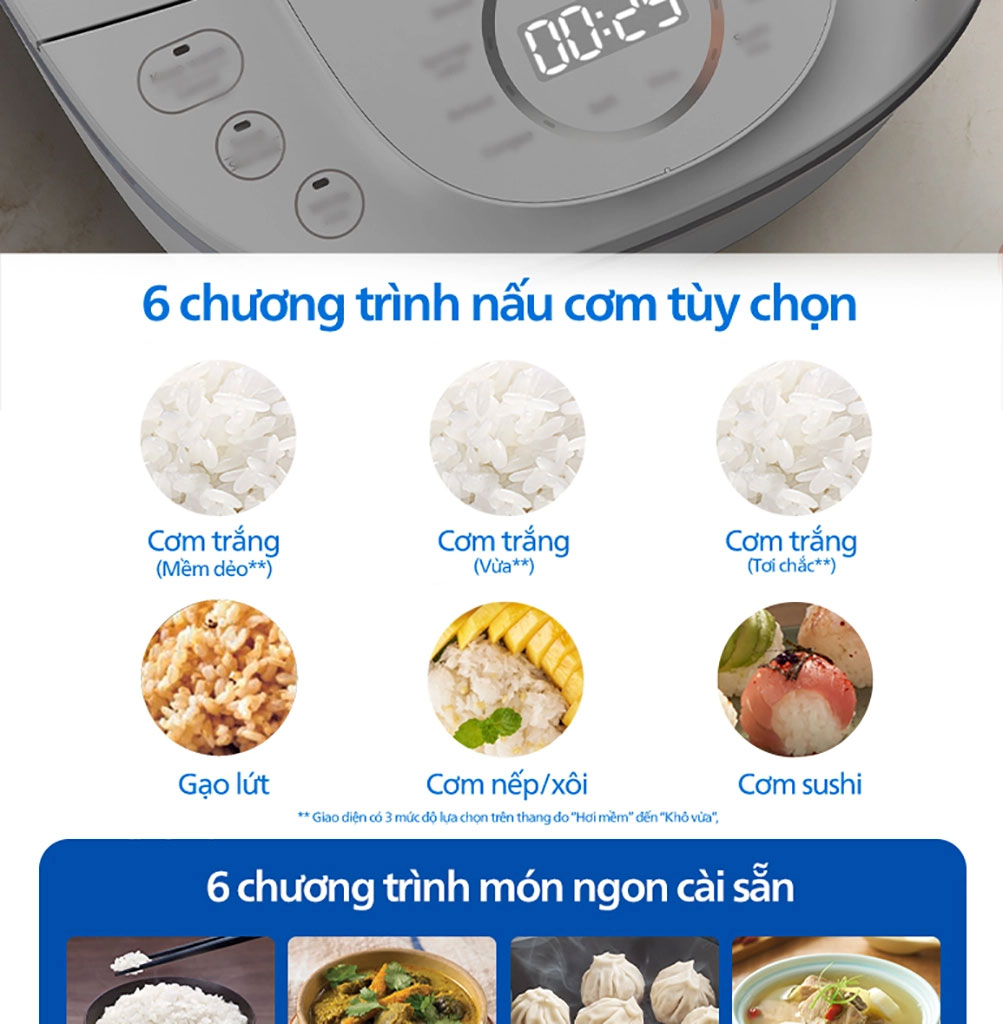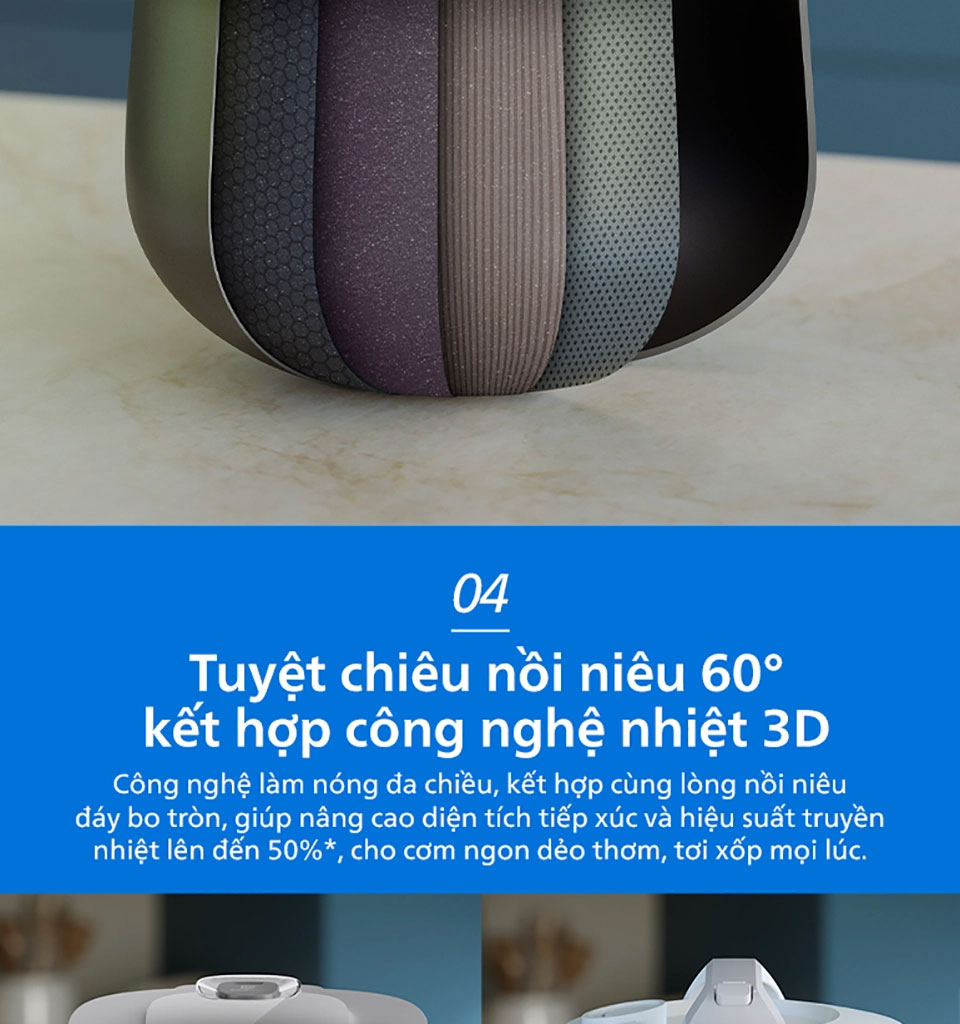 Công nghệ nhiệt 3D thông minh giúp nhiệt độ thẩm thấu sâu và đều khắp mọi góc cạnh của gạo, mang lại cơm chín đều, tơi xốp mà không bị khô hay nhão. Ngoài ra, lớp chống dính với bột kim cương giúp nồi không bị trầy xước, dễ dàng vệ sinh sau khi sử dụng.