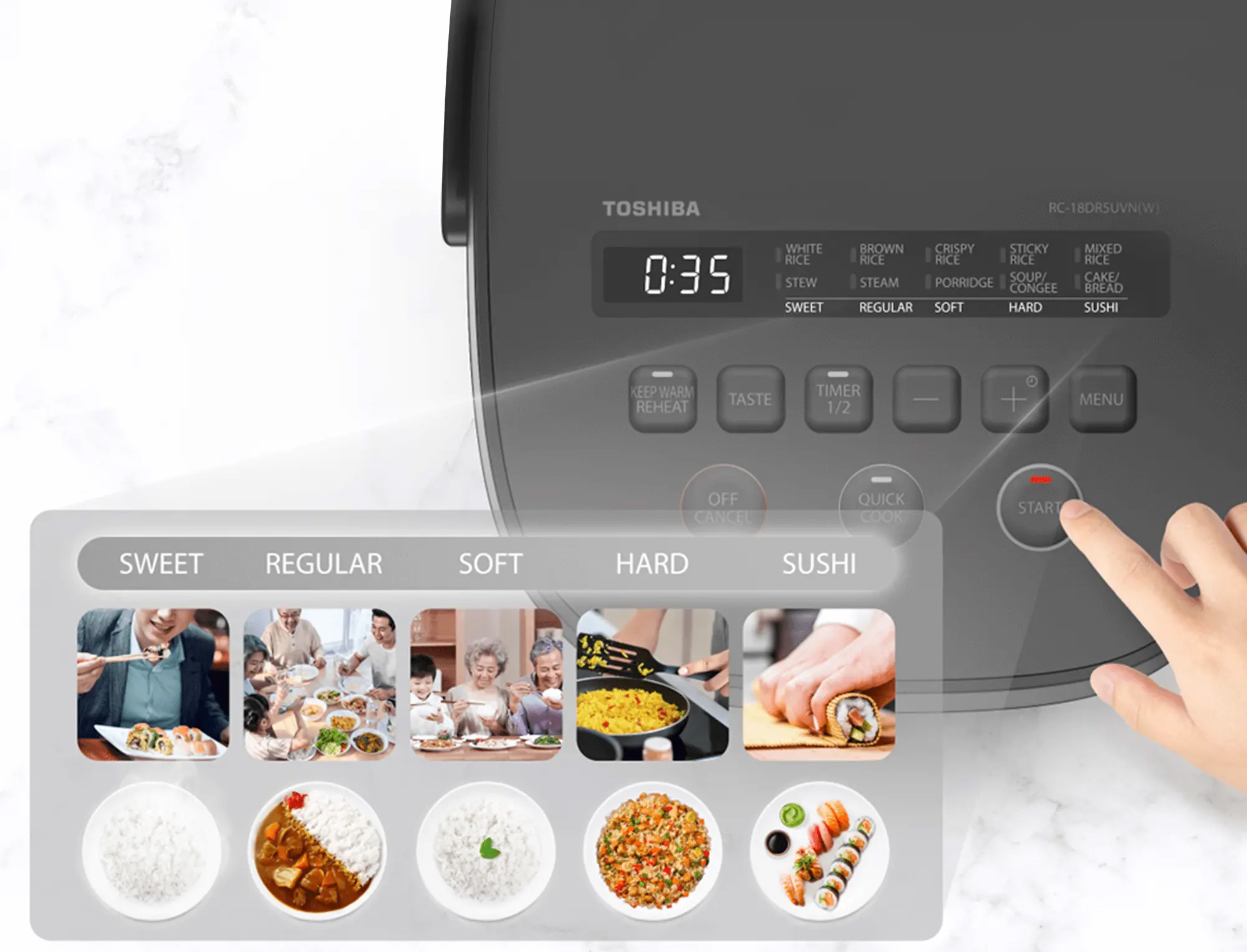 Với 12 chương trình cài đặt sẵn đa dạng, công suất lớn 680W và được ứng dụng các công nghệ nấu hiện đại, sản phẩm nồi cơm điện tử Toshiba RC-10DR5UVN(H) với dung tích 1 lít sẽ là sự lựa chọn hợp lý cho các gia đình nhỏ có từ 2 – 4 thành viên.