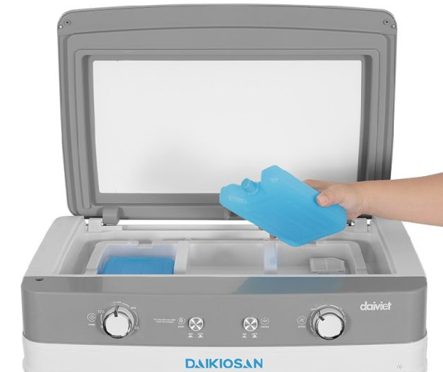 Đặc biệt, máy làm mát còn đi kèm hộp đá khô, giúp làm mát hiệu quả hơn trong những ngày nóng nực, chỉ cần cho nước vào hộp đá và đặt vào ngăn đá tủ lạnh. Việc kết hợp đá khô với khả năng làm mát mạnh mẽ của quạt mang lại hiệu quả làm lạnh sâu và nhanh chóng.