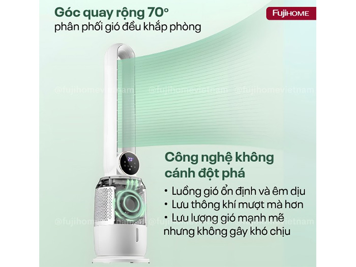 - Góc xoay linh hoạt 70 độ: Giúp phân phối gió đều khắp phòng mà không cần di chuyển quạt.