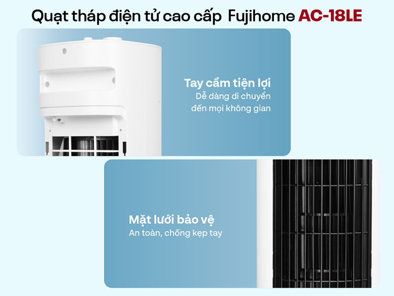 Quạt tháp Fujihome AC-18LE sở hữu thiết kế thon gọn, hiện đại, dễ dàng hòa hợp với nhiều không gian như phòng khách, phòng ngủ hay văn phòng. Kiểu dáng hình trụ tròn đứng cân đối không chỉ tiết kiệm diện tích mà còn tạo điểm nhấn sang trọng, tinh tế cho nội thất. Điểm nổi bật trong thiết kế của sản phẩm là hệ thống cửa gió dạng nan dọc, hạn chế nguy cơ trẻ nhỏ đưa tay vào quạt. Đây là một cải tiến an toàn vượt trội so với các loại quạt truyền thống, đồng thời cũng giúp việc vệ sinh trở nên đơn giản và nhanh chóng hơn.