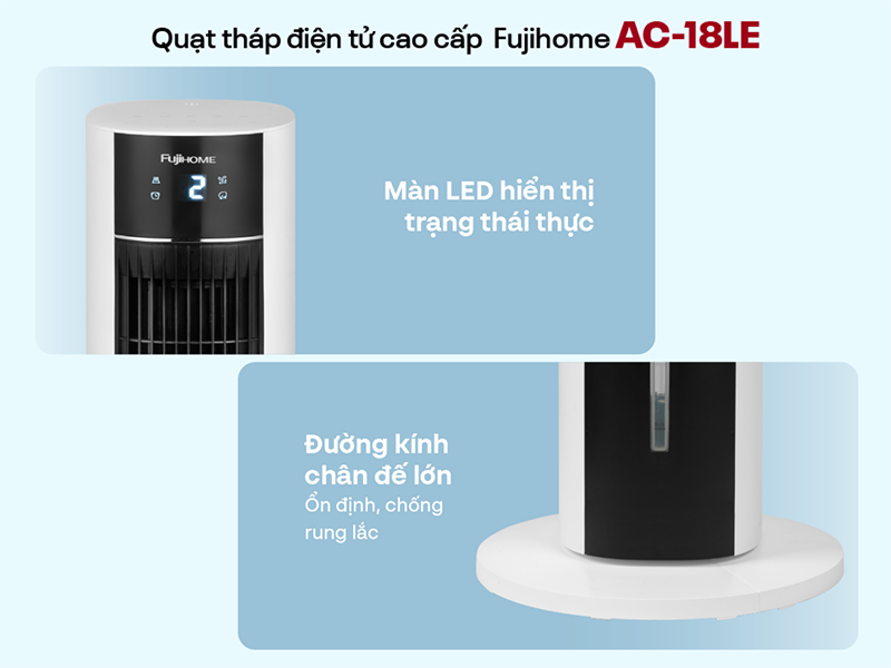 Fujihome AC-18LE được trang bị bảng điều khiển cảm ứng nhạy bén, giúp người dùng dễ dàng thao tác chỉ với một chạm. Màn hình LED sắc nét hiển thị đầy đủ các thông tin cần thiết như nhiệt độ phòng, chế độ hoạt động và tốc độ gió, giúp bạn theo dõi và điều chỉnh chế độ làm mát một cách tiện lợi và chính xác. Bảng điều khiển được bố trí ở phía trên đầu quạt, giúp bạn thao tác thuận tiện mà không cần cúi người.