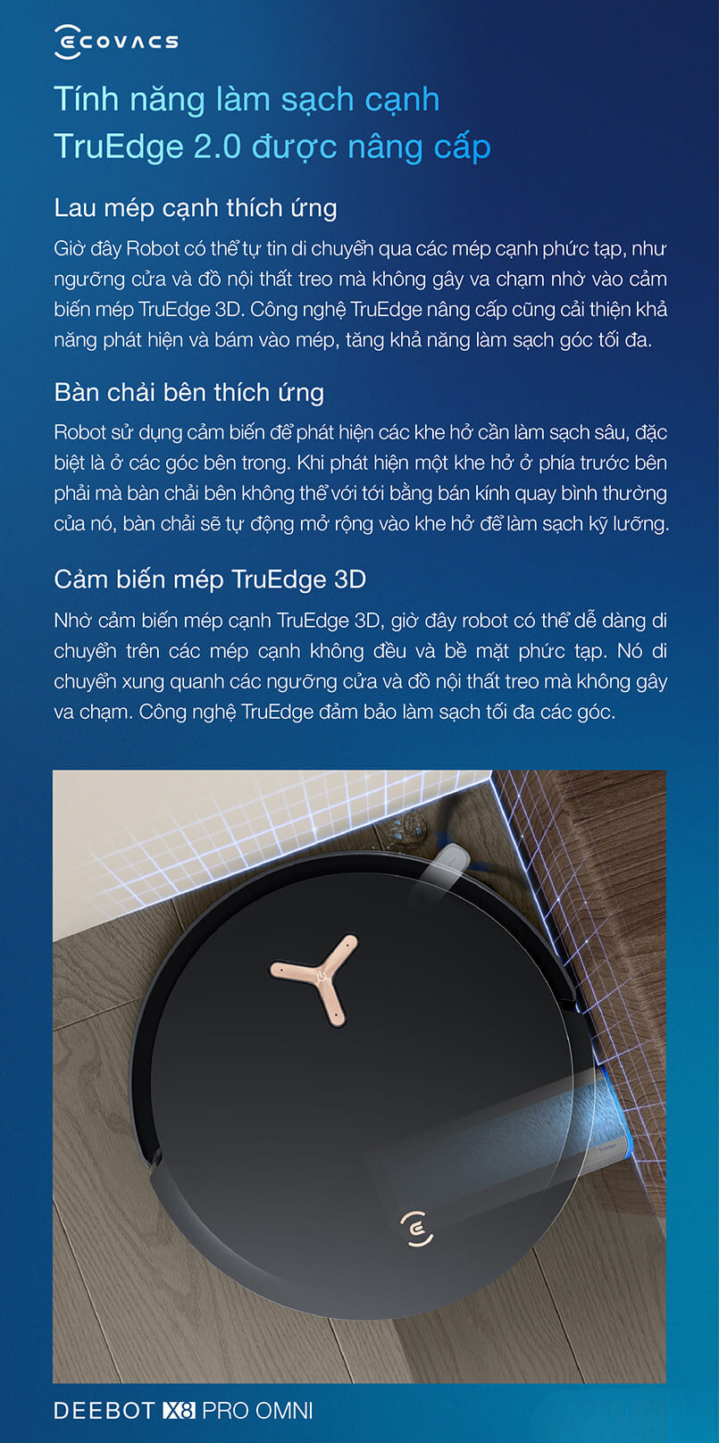 Với Công nghệ làm sạch cạnh TruEdge 2.0 tiên tiến, Ecovacs X8 Pro Omni có thể di chuyển một cách linh hoạt những khu vực khó tiếp cận. Cụ thể hơn, nhờ có cảm biến mép TruEdge 3D này, robot có khả năng phát hiện ra khe hở ở phía trước mà chổi góc bên không thể với tới được. Lúc ấy, robot Ecovacs X8 Pro Omni sẽ tự động mở rộng “cánh tay” của mình để bao phủ toàn bộ khu vực đó, đảm bảo không chừa lại bất kỳ hạt bụi nào. Nhờ vậy mà không gian luôn sạch sẽ, thoáng mát, ngăn ngừa tình trạng bụi bẩn ô nhiễm.