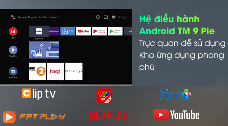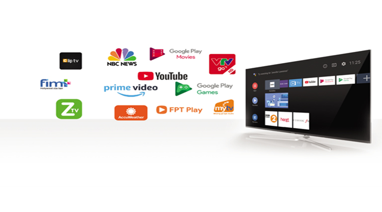 Kho ứng dụng phong phú thỏa mãn nhu cầu giải trí đa dạng của mọi thành viên trong gia đình bạn. Hệ điều hành Android TM 9 Pie bản quyền từ nhà phát triển Google LLC mang đến cho bạn hàng trăm lựa chọn ứng dụng phong phú và thịnh hành: Youtube, Amazon Prime Video, FPT Play, VTV Go, Fim+, Zing MP3…
