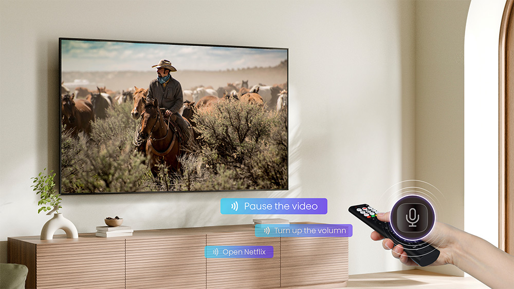 Tivi Hisense 50A6Q được trang bị remote thông minh tích hợp tính năng Voice Control, cho phép điều khiển tivi dễ dàng chỉ bằng giọng nói. Bạn có thể tìm kiếm nội dung, điều chỉnh âm lượng hoặc chuyển đổi ứng dụng mà không cần thao tác phức tạp. Tính năng này đặc biệt tiện lợi khi bạn muốn tìm nhanh một bộ phim hoặc chương trình mà không tiện bấm từng chữ cái. Remote thông minh kết hợp với hệ điều hành VIDAA sẽ mang đến trải nghiệm sử dụng hiện đại, tiết kiệm thời gian và nâng cao sự tiện nghi.