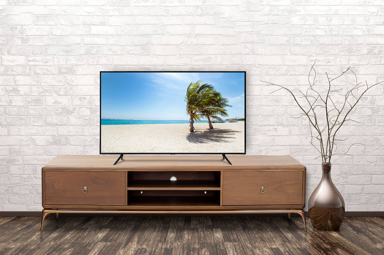 Với cặp chân đế hình chữ V úp ngược vững vàng trên mọi mặt phẳng, Tivi Samsung 4K 55 inch tôn lên sự tinh tế, sang trọng cho căn phòng.