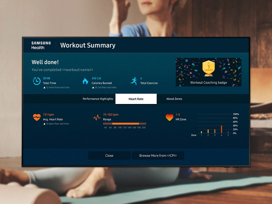 Samsung Health tích hợp trên TV giúp bạn tiện lợi giữ dáng xinh khi ở nhà với tính năng theo dõi dữ liệu trên màn hình, bao gồm số lượng bài tập đã hoàn thành, tổng thời gian tập luyện và lượng calo đã đốt cháy — bạn thậm chí có thể đồng bộ hóa dữ liệu từ một thiết bị tương thích hoặc thiết bị đeo.