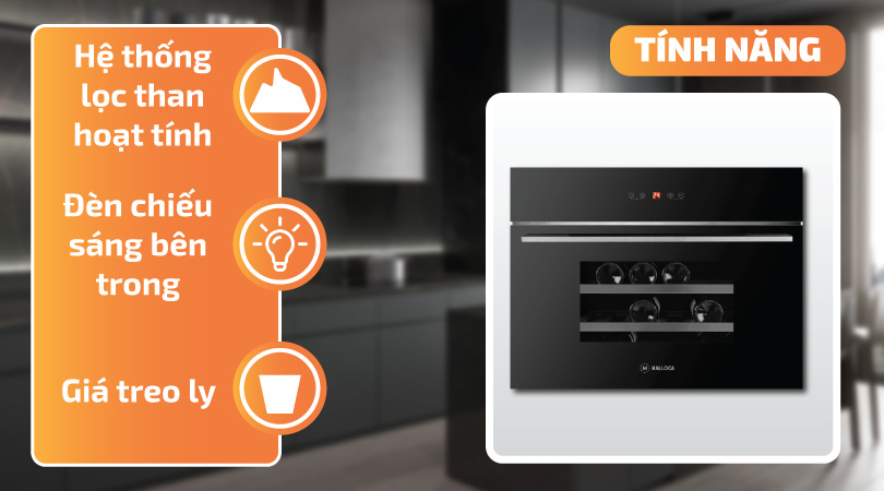 Hệ thống lọc than hoạt tính giúp làm sạch không khí bên trong tủ, ngăn rượu bị ảnh hưởng bởi mùi của môi trường.