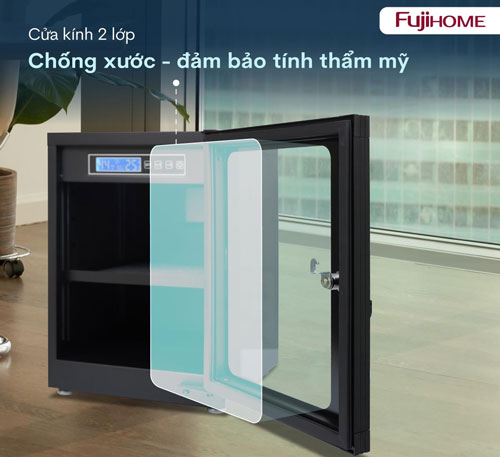 Đặc biệt chiếc tủ chống ẩm này còn được trang bị cửa kính hai lớp, có khả năng chống xước hiệu quả. Xung quanh cánh cửa tủ còn được bao bọc bởi hệ thống gioăng cao su để duy trì độ ẩm bên trong tốt hơn.