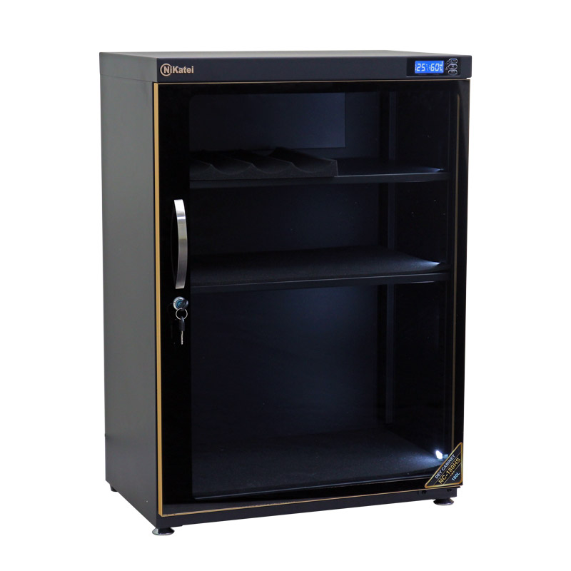 Tủ chống ẩm chuyên dụng Nikatei NC-180HS (180 lít) : Ưu điểm nổi bật hơn các sản phẩm cùng loại trên thị trường : trang bị sẵn hệ thống đèn LED chiếu sáng bên trong tủ ( có thể điều chỉnh tắt/bật được theo ý muốn ), trên mỗi khay có 1 lớp mút mềm để bảo quản tốt hơn máy ảnh, ống kính đắt tiền, đèn hiển thị tủ đang trong quá trình hút ẩm hoặc đang ở trạng thái nghỉ.