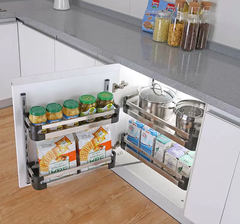 Thiết kế trượt đôi, tăng cường khả năng chịu tải của sản phẩm và giữ cho phần kéo ra ổn định. Công nghệ Đức, chịu tải siêu cao, thanh dẫn hướng cấu trúc con lăn mở rộng, cấu trúc liên kết đơn giản và hoàn toàn mới, kéo giỏ bên trong ra khi mở cửa. Điểm chịu tải của cửa tủ tập trung vào đáy tủ, bảo vệ cửa không bị biến dạng.
