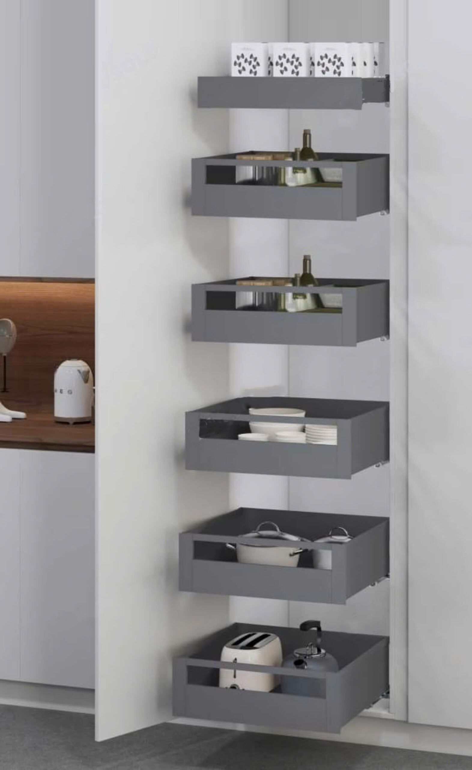 Thiết kế khá nhỏ gọn, giúp bạn tận dụng được tối đa không gian lưu trữ hệ tủ bếp. Tủ kho độc lập 6 tầng Eurogold EUM23660G được thiết kế bao gồm rổ đựng và hệ thống ray trượt giảm chấn. Việc sử dụng (kéo ra/ đẩy vào) trở nên êm ái mà vô cùng nhẹ nhàng.