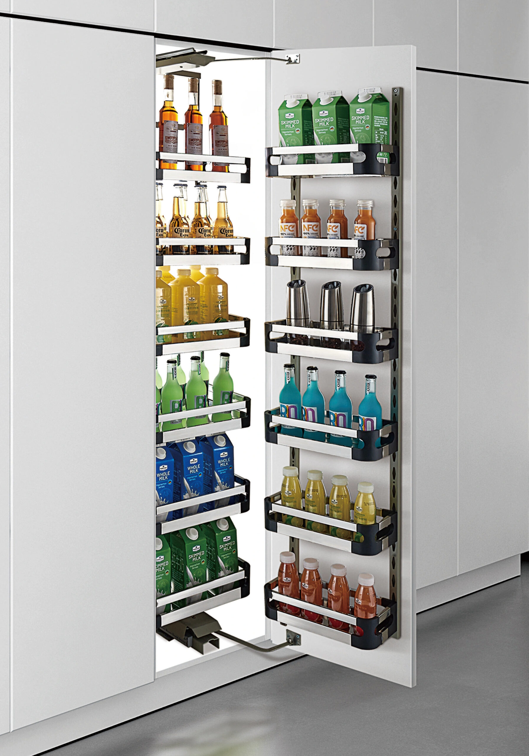 Các khay đựng được thiết kế linh hoạt phù hợp với nhiều kích thước chai lọ, gia vị, đồ khô… khác nhau trong không gian bếp.