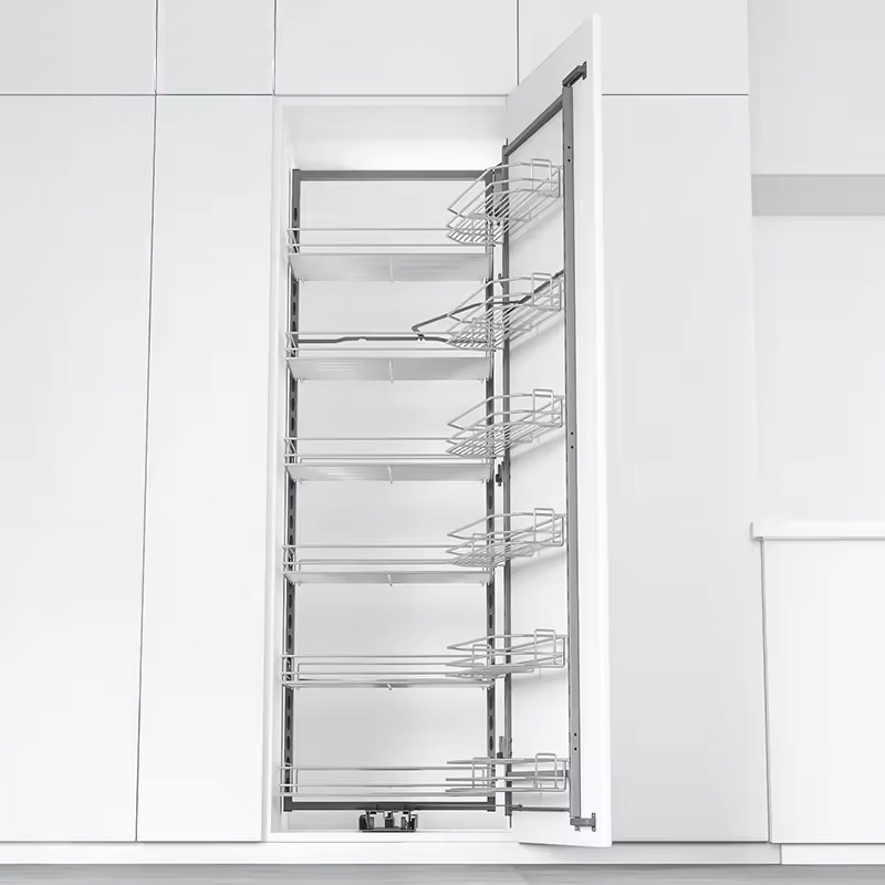 Thiết kế dạng nan góp phần tạo cảm giác chắc chắn, khỏe khoắn cho hệ tủ kho chứa đồ khô. Ngoài ra với thiết kế đơn giản 6 tầng, 12 rổ đựng thì được thiết kế thu gọn trong khoang tủ góp phần tăng tính thẩm mĩ, tiết kiệm không gian cho căn bếp. Đặc biệt phù hợp với gia đình hộ chung cư, gia đình có không gian bếp nhỏ.