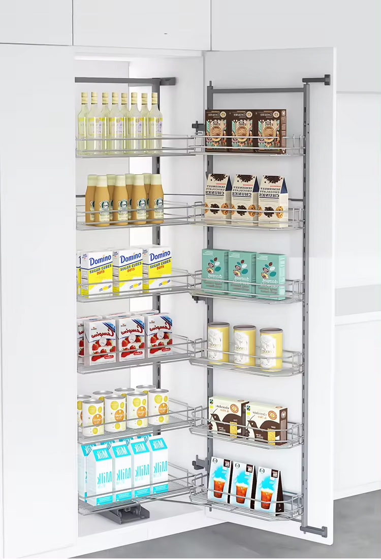 Thay vì xếp đồ đạc một cách không khoa học tạo nên sự bề bộn cho bếp thì hệ tủ kho chứa đồ khô sẽ giúp căn bếp luôn sạch sẽ, gọn gàng. Thiết kế 6 tầng, 12 rổ đựng, rổ lớn có thể chứa 5kg và rổ nhỏ có thể chứa 3kg bạn có thể tha hồ cất gọn tất cả các vật dùng, đồ ăn.. vào khoang tủ phía sau cánh cửa tủ.