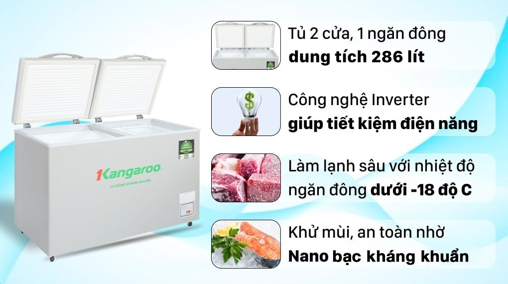 Tủ đông Kangaroo Inverter 286 lít KGFZ290IC1 là sự lựa chọn hợp lý cho những gia đình, cửa hàng tạp hóa,… có nhu cầu sử dụng và lưu trữ thực phẩm ngăn đông lớn. Với nhiều công dụng được tích hợp, chiếc tủ đông này sẽ giúp quá trình lưu trữ và bảo quản thực phẩm trở nên thuận tiện và nhanh chóng hơn.
