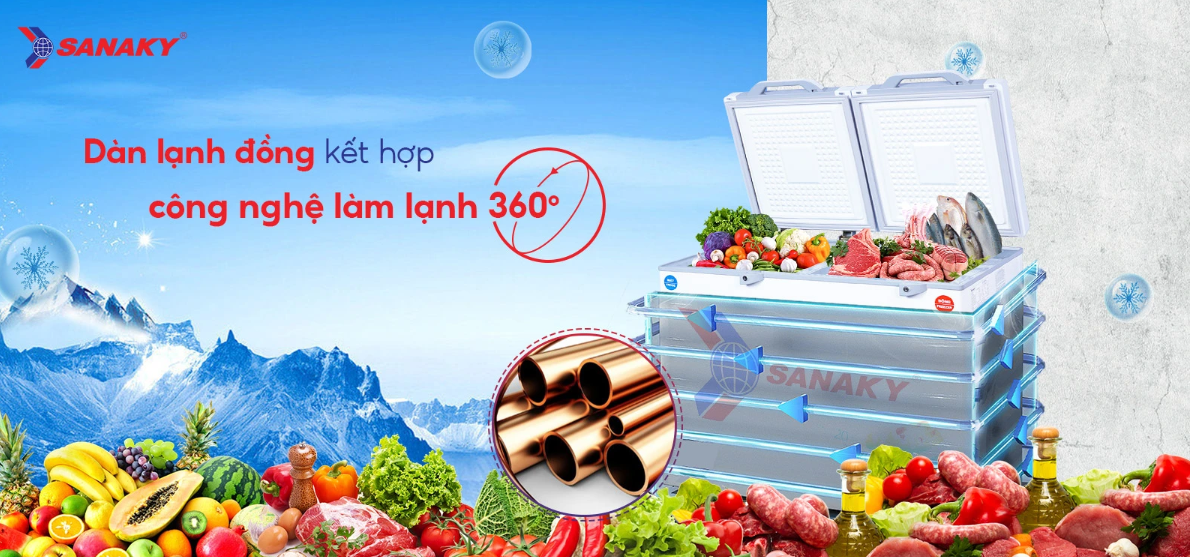 Công nghệ làm lạnh 360 độ: kết hợp với dàn lạnh đồng, công nghệ làm lạnh 360 độ giúp hơi lạnh sẽ được tỏa đều bên trong tủ, tác động toàn diện lên bề mặt thực phẩm, đem đến hiệu quả làm lạnh sâu, đóng đông triệt để.