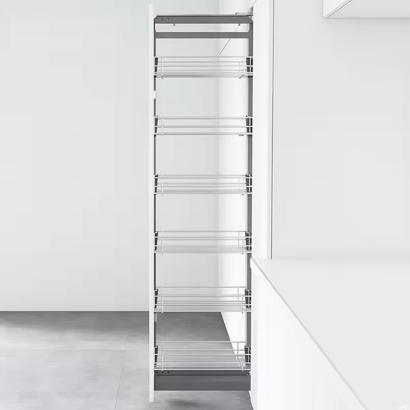 Thiết kế dạng nan góp phần tạo cảm giác nhẹ nhàng, thanh thoát cho tủ kho. Ngoài ra với thiết kế 6 tầng, 12 rổ đựng thì được thiết kế thu gọn trong khoang tủ góp phần tăng tính thẩm mĩ, tạo sự gọn gàng cho căn bếp nhà bạn.