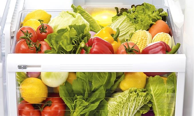 Tủ lạnh có ngăn rau quả lớn dễ dàng thao tác và sắp xếp, duy trì độ ẩm để giữ rau quả luôn tươi ngon. Đèn LED giúp tăng cường lượng vitamin C cho rau củ quả. Ngăn mát dạng trượt lưu trữ thực phẩm chế biến sẵn và chế phẩm từ sữa.