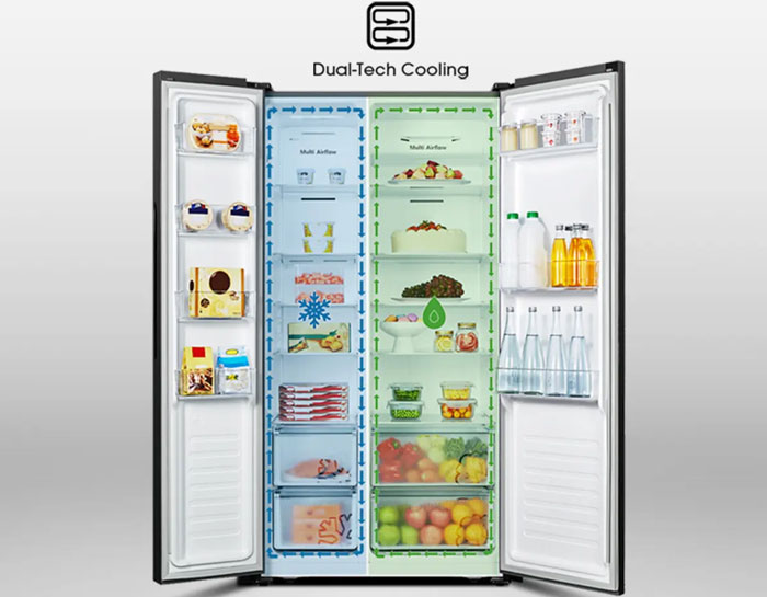 Chiếc tủ lạnh side by side Hisense này được ứng dụng công nghệ làm lạnh kép Dual-Tech Cooling hiện đại. Đây chính là hệ thống làm lạnh kép, hoạt động ở cả ngăn đông và ngăn mát giúp duy trì nhiệt độ, độ ẩm lý tưởng cho các ngăn tủ, nhờ vậy thực phẩm luôn đón nhận được hơi lạnh tốt để giữ được độ tươi ngon, dưỡng chất như lúc ban đầu trong thời gian dài.