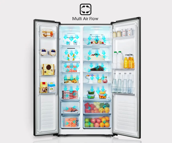 Công nghệ làm lạnh đa chiều Multi-Air Flow cũng là một trong những công nghệ làm lạnh chất lượng, nổi bật trên chiếc tủ lạnh này. Cụ thể, Multi-Air Flow sẽ phân bổ hơi lạnh đồng đều khắp mọi ngóc ngách trong tủ lạnh thông qua các lỗ thông hơi ở mọi tầng kệ, không để bất kỳ khu vực nào bị bỏ sót, từ đó giúp thực phẩm dù được đặt ở vị trí nào cũng luôn được đón nhận hơi lạnh để luôn tươi ngon, được lưu trữ tốt hơn.