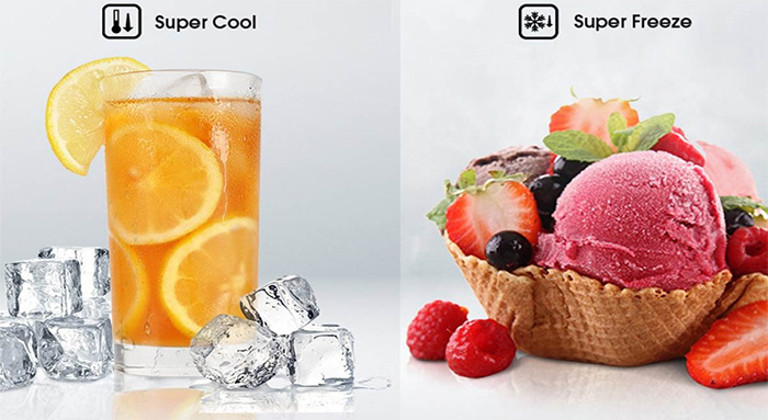 - Tính năng Super Cool: Tính năng này có khả năng nhanh chóng giảm nhiệt độ bên trong tủ lạnh xuống +2 độ C trong vòng 6 giờ giúp giữ nguyên hương vị, màu sắc và giá trị dinh dưỡng của thực phẩm.