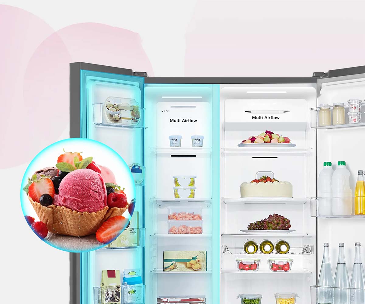 Công nghệ làm lạnh đa chiều giúp phân phối không khí lạnh đồng đều khắp các ngăn kệ, duy trì nhiệt độ tối ưu liên tục trong suốt khoang lạnh. Cơ chế này đảm bảo thực phẩm được ướp lạnh hoàn hảo, bất kể chúng được đặt ở vị trí nào.