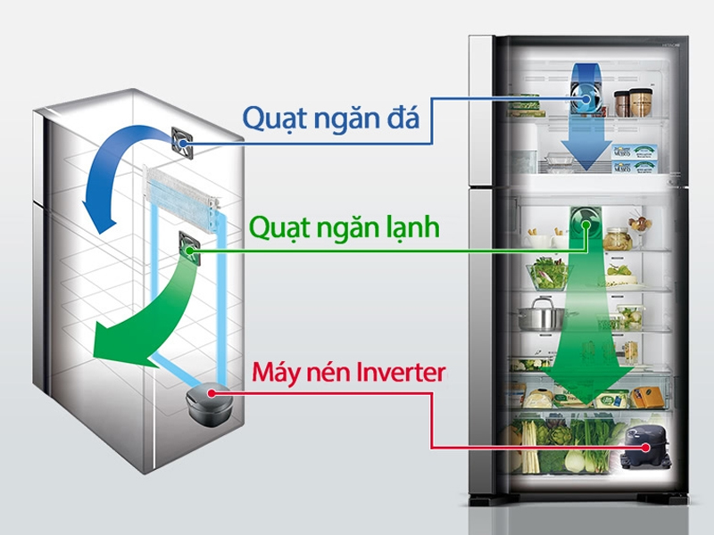 Tủ lạnh Hitachi 339 lít R-FG450PGV8 (GBW) có máy nén Inverter làm lạnh cực mạnh, tạo lượng lớn không khí lạnh, làm lạnh chế độ năng lượng thấp. Hệ thống quạt kép cung cấp khí lạnh ngăn đá và ngăn lạnh riêng. Không cần ổn áp, giữ lạnh thêm 12 giờ khi mất điện.